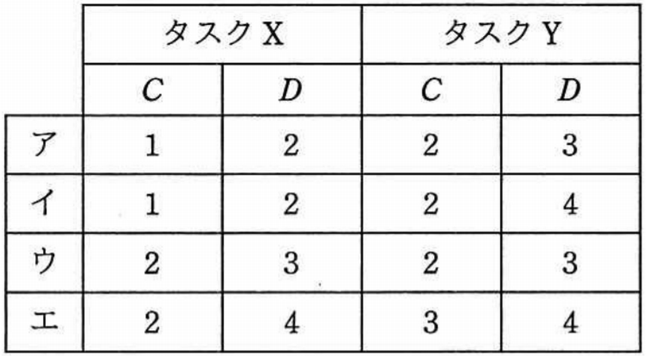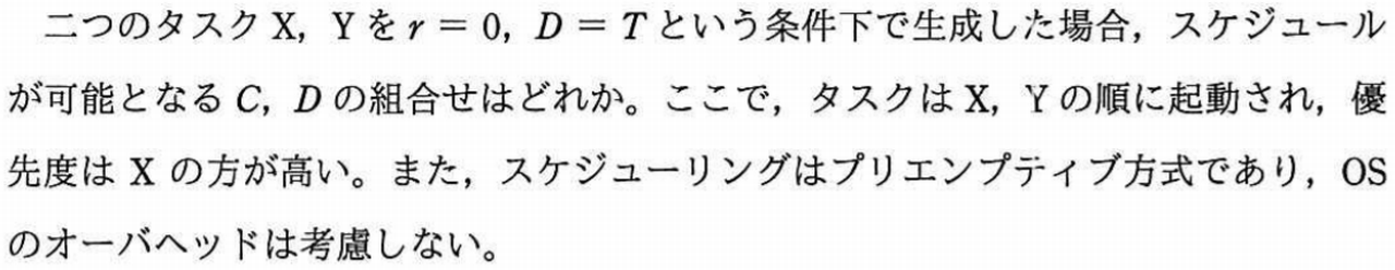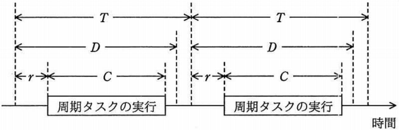 リアルタイム OSで用いられる, タスクがデッドラインを必ず守るデッドラインスケジューリングでは,周期タスクを図のように次の四つのバラメタr,C,D,T(0<r+C≦D≦T)の組みで表現することができる。
